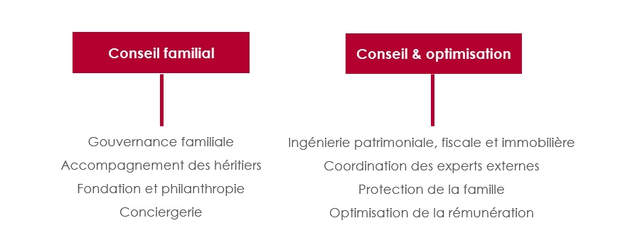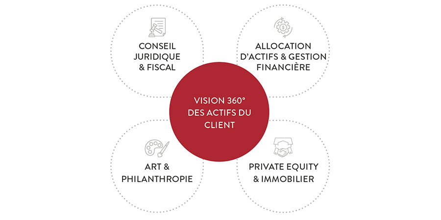 Au travers de nos services de gestion, d’investissement en coté et non coté, nos family officers tissent de nouveaux liens entre biens immobiliers, œuvres d’art, objets de collection et actifs financiers. Ils conseillent et accompagnent nos clients dans toutes les dimensions des patrimoines et de leur croissance, en matière d’analyse et de conseil, de gestion et de reporting, de suivi administratif, de mise en conformité, de relations avec l’ensemble des parties prenantes (avocats, assureurs, notaires, banquiers, etc.).